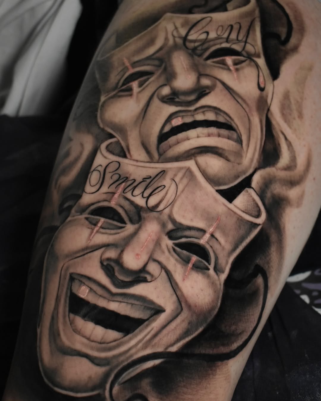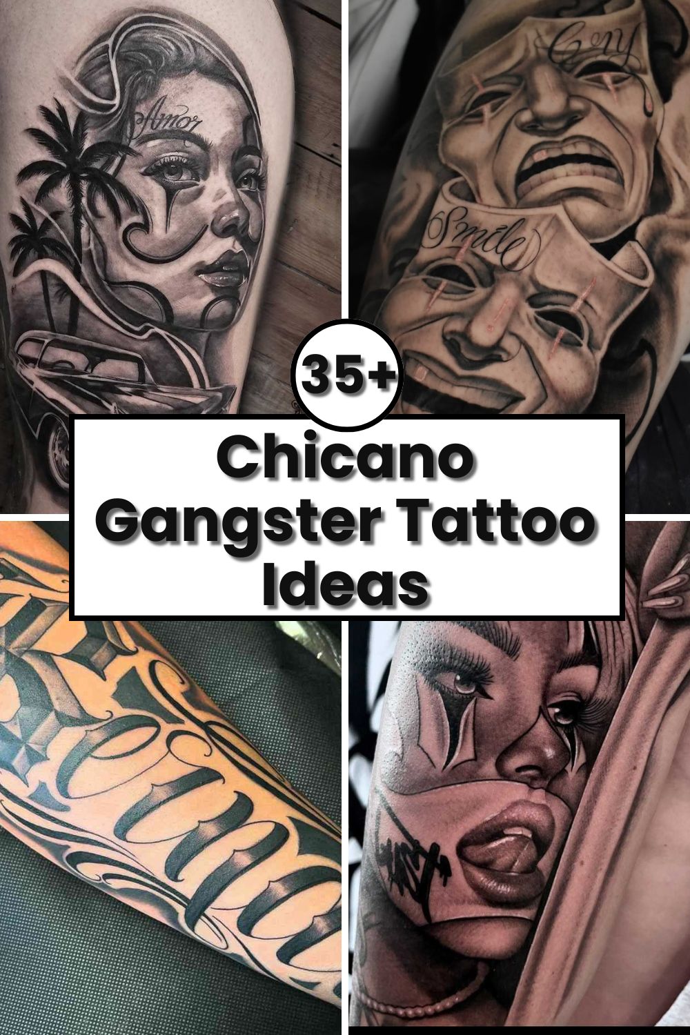 Chicano gangster tattoo ideas are a gritty portrait of barrio life, culture, and survival. Typically, these tattoos come with bold black and grey designs of gangsters, lowriders, masks, guns, and graffiti-style lettering. (Many designs feature the iconic “Smile Now, Cry Later” masks of life’s dualities or Old English script for loyalty and respect.