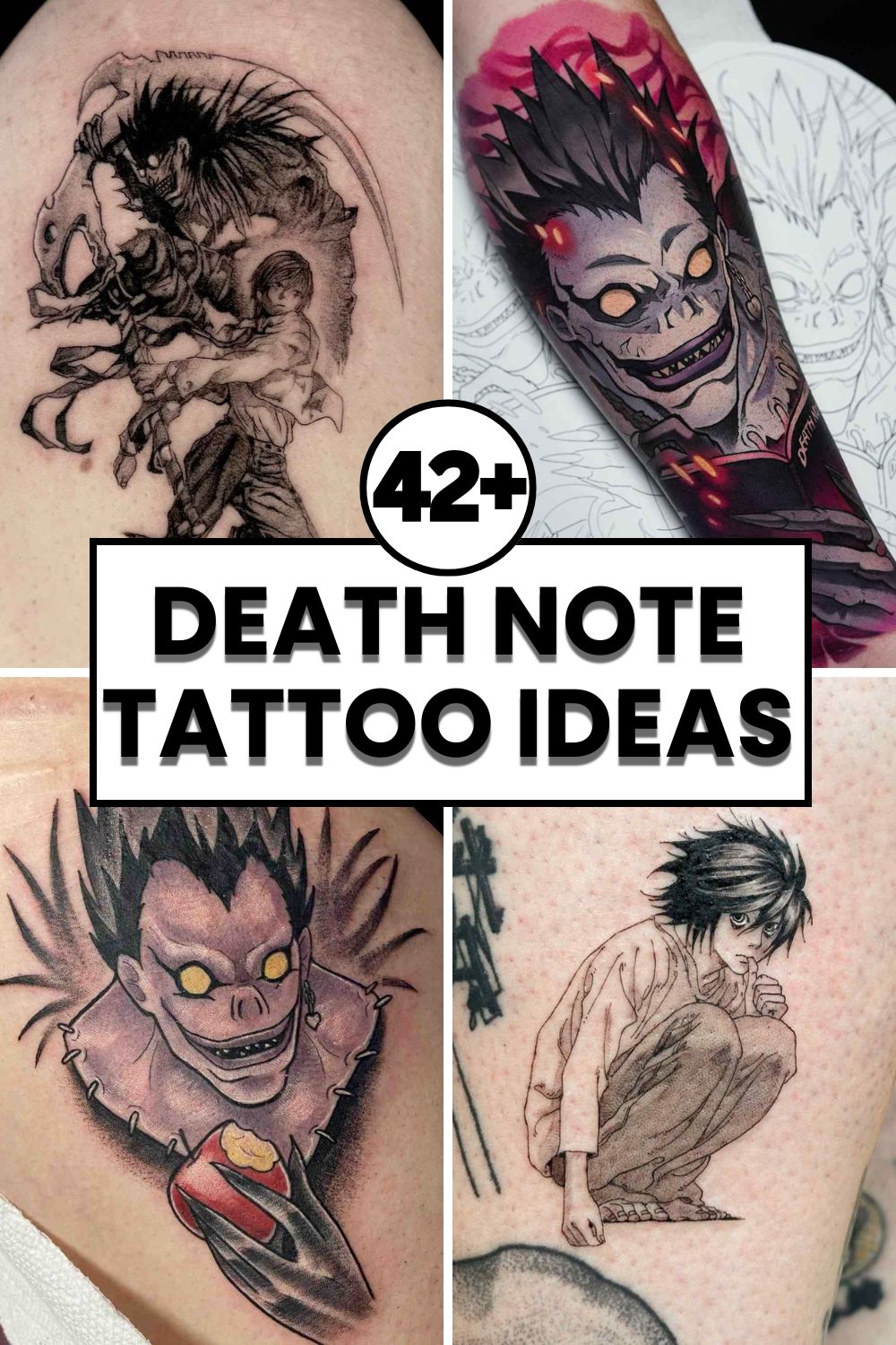 The series tackles themes of justice, morality, power, and destiny, which is why the tattoos inspired by it are also packed with symbolism. Death Note Statue And U-treasure. Death Note Tattoo Ideas. Whether you fancy simple symbols or more elaborate portraits, Death Note tattoos are a way for fans to display their love of the story and everything that comes with it; death—mysterious, complete, and spell-binding. They have the potential to be both stunning visually and incredibly personal.