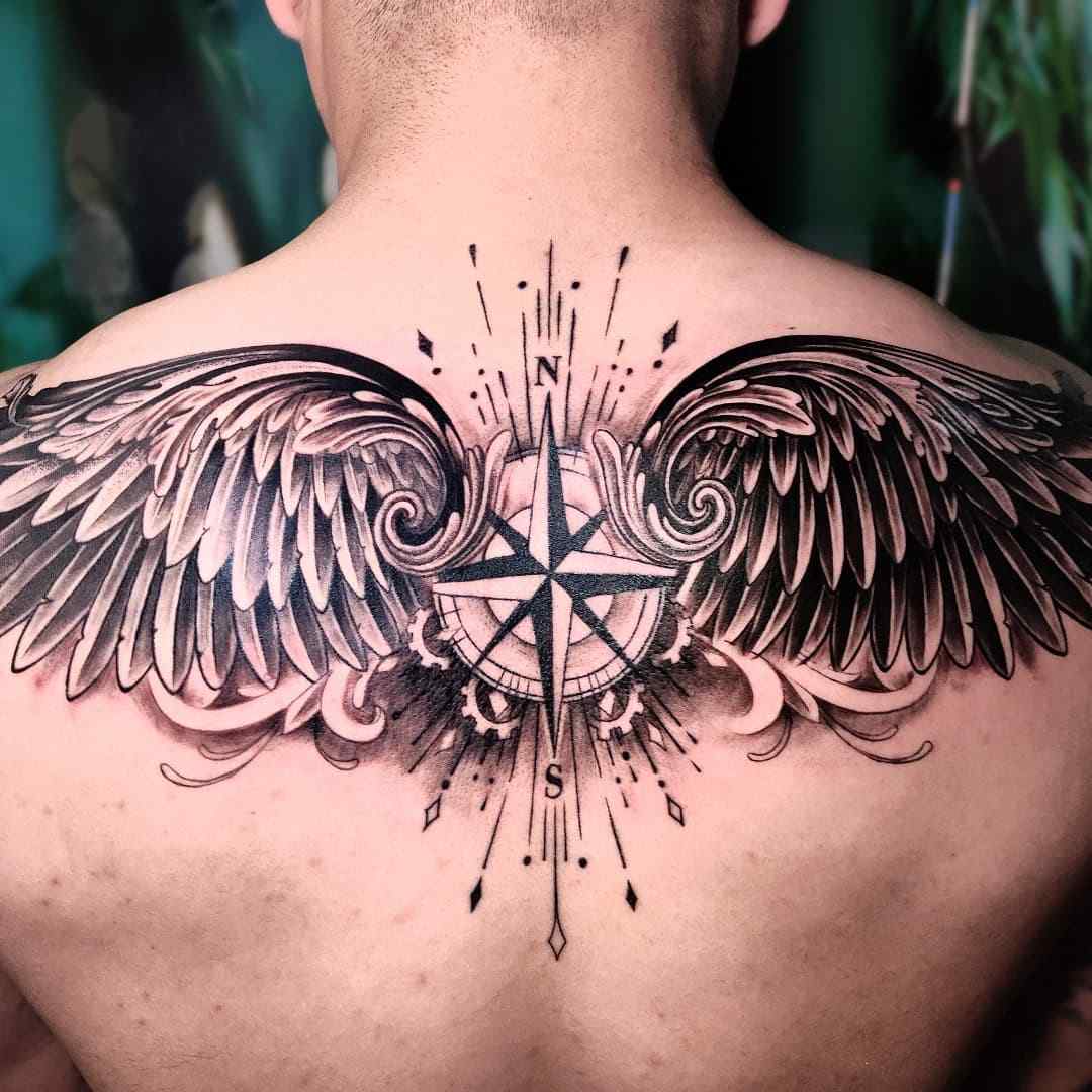 Benefits: Bold, detailed, and shows strength. Steps: Full back/arm piece, added wings & dark textures.